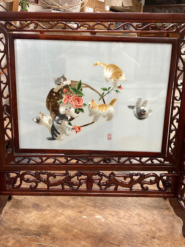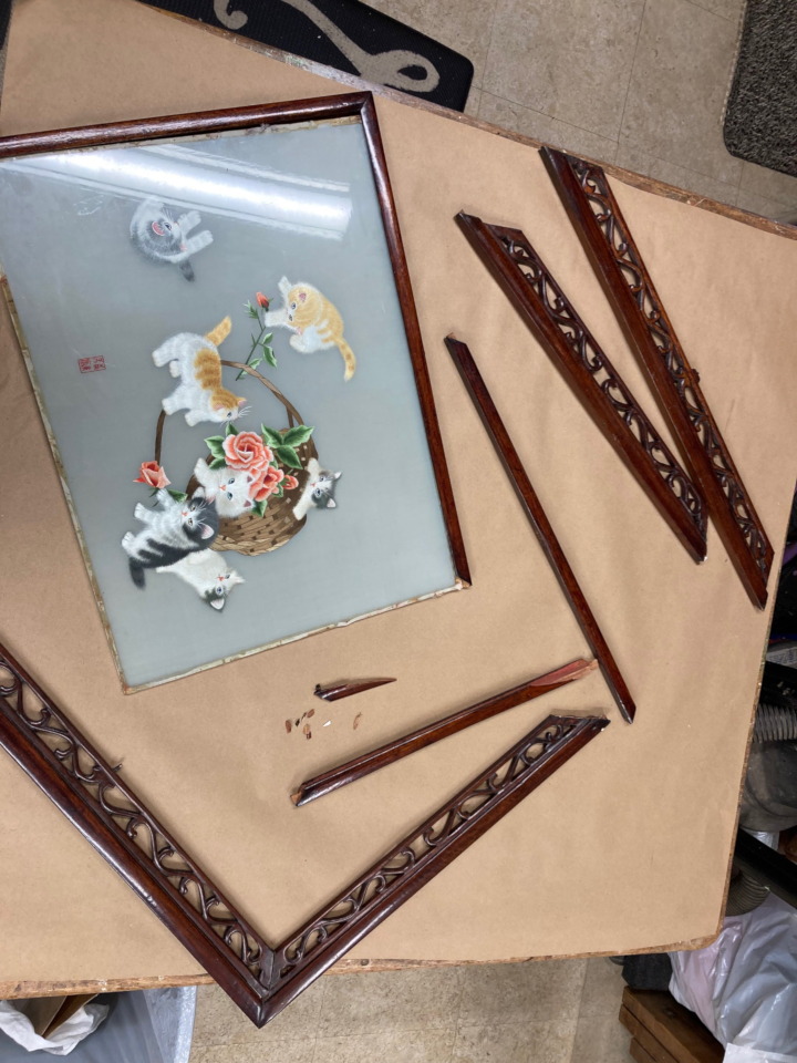 A Japanese silk embroidered scene between glass. The frame came to me in many pieces. |